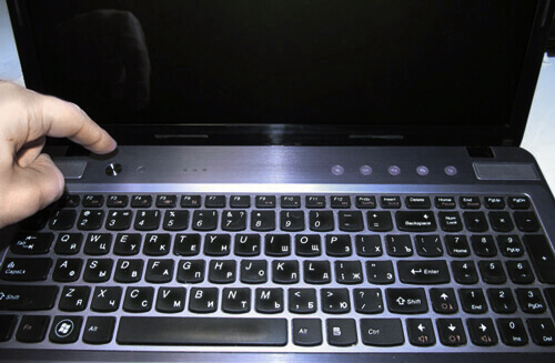 Обычно она находится над клавиатурой с правой или левой стороны. В редких случаях кнопка включения может быть на торце ноутбука в виде рычажка который нужно потянуть вбок для включения ноутбука.